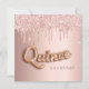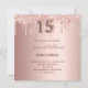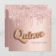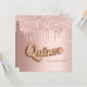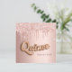Para uma Quinceañera luxuosa, festa de aniversário ano. Um fundo rosa dourado com rosa dourado e pingos cor-de-rosa, aparência de pingar tinta. O texto: Quince é escrito com uma fonte no estilo do balão. Personalizar e adicionar um nome e detalhes da parte