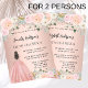 Um convite moderno, na moda e glamouroso para 2 Quinceañeras, festas de aniversário 15. Um fundo rosa de ouro decorado com flores cor-de-rosa pinceladas, flores e uma garota vestindo um vestido de bola. Os nomes são escritos com um moderno estilo escrito à mão. Personalize e adicione os detalhes da sua festa. Um nome em cada lado. 1 folha = 1 convite impresso de borda a borda.