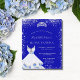 Uma tendência e um convite glamouroso para uma Quinceañera, 15 festa de aniversário. Um fundo azul real com poeira cintilante de prata falsa, uma tiara e um vestido. O nome é escrito com um moderno estilo escrito à mão. Personalize e adicione os detalhes da sua festa.