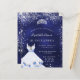Um convite moderno, na moda e glamouroso para uma Quinceañera, festa de aniversário 15. Um fundo azul da meia-noite com pó falso prateado, tiara e vestido. A cor azul é irregular. O nome é escrito com um moderno estilo escrito à mão. Personalize e adicione os detalhes da sua festa.