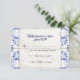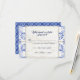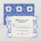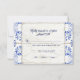 Cartão de resposta RSVP que inclui uma linha para escolhas de menu e para quantos lugares você reservou para seu convidado. Qualquer linha pode ser apagada no campo do modelo se não for necessária. Ideal para celebrações de casamento rústico, farmhouse chic, outdoor farm ou celeiro. Pintado em azul lápis, cobalto e azul naval misturado com branco e um toque de bege cinza. Inspirado em designs vintage de azulejos mediterrâneos da Itália, Portugal e outros países do Oriente Médio. Elegante e sofisticado o suficiente para um casamento country chic luxuoso. Arte copyright, Audrey Jeanne Roberts