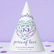 Os chapéus da festa de aniversário de casamento de 55 anos de Alexandrite. A design apresenta uma tipografia roxa de escrita azul em branco com os seus nomes e as palavras de comemoração de 55 anos de amor no estilo de escrita e uma pedra angular verde roxa no estilo alexandrite. Personalize com seus nomes e datas de casamento de aniversário. O 55º aniversário de casamento está associado à pedra gemônica Alexandrite e o coração simboliza o amor. Outros itens de aniversário de casamento de ametista disponíveis. Line art e design por www.mylittleeden.com no zazzle.