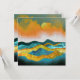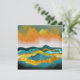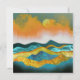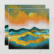Cena de paisagem abstrato de uma zona de montanha com colinas rolantes e uma tempestade de chuva em laranja, ouro, azul e ciano.