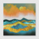 Cena de paisagem abstrato de uma zona de montanha com colinas rolantes e uma tempestade de chuva em laranja, ouro, azul e ciano.