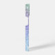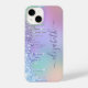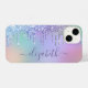 Capas de iphone elegante e giro personalizada, com brilho suave de gotejamento de arco-íris de cor unicórnio num fundo roxo, rosa, azul, verde e laranja. Personalize com seu nome em um roteiro roxo de tendência na moda com baloiços.