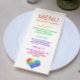 Cardápio de casamento divertido para um casamento de gay ou lésbicas, com um coração de arco-íris e fontes em cores compatíveis.