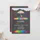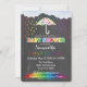 Este adorável Chá de fraldas Rainbow Rainbow Raindrops O convite apresenta um guarda-chuva branco de bolinhas arco-íris debaixo de nuvens macios em meio a quedas de gotas de arco-íris caindo que piscina em uma poça colorida de arco-íris. Isto é tudo sobre um fundo preto, de quadro negro. A parte de trás do convite é um fundo preto no estilo do giz é uma chá de queda de arco-íris.
