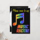 Este design de convite para o recital de música divertida e colorida apresenta um símbolo de nota musical e a mensagem "Por favor venha ao meu CONSIDERANDO MÚSICO". A nota de música e as palavras "MUSIC RECITAL" apresentam um padrão de colorir gradiente do espectro arco-íris. Os detalhes no verso podem ser personalizados. Um convite como este pode ser usado para convidar convidados para um recital musical.