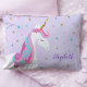 Este travesseiro apresenta um belo e branco design unicórnio arco-íris com estrelas e falso brilho dourado sobre fundo púrpura pastel. Personalize-o com um nome.
