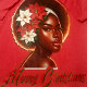Linda moça afro-americana com belas poinsetos vermelhas e brancas em seu cabelo. Ela espera que todos tenham um Natal muito feliz.