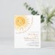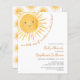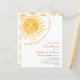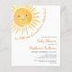 Você está planejando um chá de fraldas temático? Este belo convite para chás de fraldas apresenta o texto "Nosso pequeno raio de sol está quase aqui!" com uma aquarela sorrindo o sol amarelo e um padrão de sol nas costas. Perfeito para um chá de fraldas neutro em termos de gênero. Facilmente personalizável. Original Watercolor © Michele Davies.