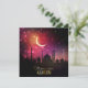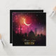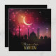 Silhueta para Ramadã com mesquita em lua crescente com um pôr do sol rosa e laranja e estrelas.