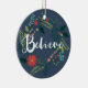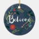 Bonito ornamento cerâmico de Natal com fundo azul escuro, ramos, folhas, bagas e flores design com texto cursivo branco que diz Acredite, uma área atrás para personalizar com seu nome familiar, nomes próprios e ano atual!