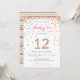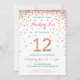 Celebre o aniversário de seu filho de 12 anos com ouro colorido, rosa, menta e macarrão de chá nesses convites de 12! Apresentando os detalhes da festa da sua filha e o número "12" em confetti. Este design adorável é super fofo e giro.