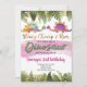 Um convite de aniversário da selva de dinossauros, rosa e dourada.