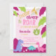 Convite de aniversário para mulheres, com dinossauros cor-de-rosa, púrpura e azul, folhas verdes e roxas.