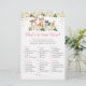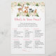 Estes elegantes "What's In Your Purse Cards" são uma forma excelente de se divertir com o seu Chá de fraldas e é garantido ser um grande sucesso! Simplesmente passá-los durante o Chá de fraldas, onde os convidados se divertirão a passar pelas suas bolsas e a verificar os itens que têm na lista. A pessoa com mais pontos ganha! A design apresenta animais lindos de floresta com florais cor-de-rosa pincelados e sotaques de folhas douradas.