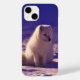 A surpreendente raposa ártica sentou-se na neve lançando uma sombra na luz esmagadora.
