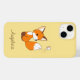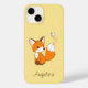 Um pequeno kit de raposa de desenho animado com orelhas grandes e cauda espumosa está observando uma borboleta fluindo.