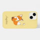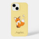 Um pequeno kit de raposa de desenho animado com orelhas grandes e cauda espumosa está observando uma borboleta fluindo.