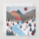 Uma bela paisagem com texturas únicas mostrando um rio e uma paisagem de montanha com uma raposa em caça de salto médio na neve em tons de vermelho, verde, azul e bege.