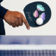 Pá de pingue-pongue personalizado com um design bonito. 3 borboletas de aquarela, pintadas de rosa, roxo e verde. Fundo de aquarela azul escuro.