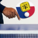 Paddle Ping pong com pavilhão da cidade de Memphis, Tennessee; bandeira vermelha, branca e azul com emblema amarelo com uma ilustração do navio