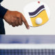 Ping Pong Paddle com uma design com a bandeira de South Bend, Indiana. Uma bandeira branca, azul e amarela com uma estrela vermelha