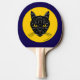 A retro-looking illustration of the face of a yellow-eyed black cat appears in a moon-like circle in this original Halloween-appropriate art by Richard H. Fay.