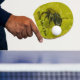 Viva o seu jogo de pingue-pongue com este remo giro com uma abelha preta coberta de pólen amarelo num lindo fundo de flores amarelas. Este Sting como uma abelha faz um remo de bobo que pode ser apenas um jogo de ping-pong. Com texto preto "Sting like a abelha".
