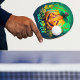 Um pá-pingue-pongue com design de Halloween, com uma abóbora de cartoon com face sorridente e olhos brilhantes, contra fundo verde e azul com vidros e nuvens girantes, a palavra "HALLOWEEN" é escrita em letra estilizada no fundo do pá, a alça do pá é feita de madeira clara com padrões vertical .