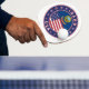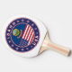 Crachá de Idaho com bandeira de Idaho e bandeira de cores dos EUA, forma arredondada. Emblema de Idaho. Selo de Idaho. Coleção dos Estados Unidos.