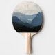 Ping pong paddle com uma fotografia de belas montanhas, céu nublado e colinas rolantes cheias de árvores em primeiro plano. esquema de cor azul da cinza.