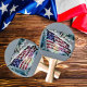 Esta imagem de bandeira americana, é destacada contra, fogos de artifício que explodem, numa exibição colorida de, vermelho, branco, azul e amarelo, flares em um céu nublado e crepúsculo, de azul ardente.
