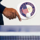 Crachá Rhode Island de Rhode Island com bandeira de Rhode Island e bandeira dos EUA, forma arredondada. Emblema de Rhode Island. Selo de Rhode Island. Coleção dos Estados Unidos.