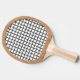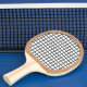 Quando você está com vontade de jogar tênis, mas tudo que você tem é uma mesa para um tribunal. Um design de tênis, amarrado em madeira, em um remo.