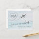 Anúncio de cartão postal de adiamento de casamento em destino de praia informa aos seus convidados de uma forma engraçada e divertida que o local ou data do casamento (ou ambos) precisam ser remarcados ou alterados devido às restrições de viagem, enquanto você ainda está descobrindo como alterar os planos de casamento. A bela textura de fundo azul aqua turquesa funciona para muitos temas de viagem e cores de praia, e nosso logotipo exclusivo de monograma de avião tem iniciais dentro com fontes de caligrafia modernas e divertidas e uma combinação de tipografia interessante. Visite a Paper Grape Destinations Zazzle Designer Shop para mais convites de casamento, avisos e anúncios de adiamento com temas de viagem e praia.