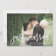Nossos anúncios de casamento chic e modernos são a maneira perfeita de deixar amigos e familiares saberem sobre sua elopeia, cerimônia secreta ou casamento privado! O "Recem casados" está sobreposto em letras brancas de pincel no estilo manuscrito em sua foto horizontal ou orientada a paisagem favorita de sangramento de cheio. Personalize com seus nomes e datas de casamento, assim como uma mensagem pessoal no verso.
