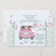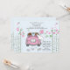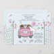 Um convite para o casamento de posto encantador, com os recém-casados a fugir. Os portões estão abertos e as flores enchem o ar. A placa diz "Recem casados" e as latas de estanho estão amarradas na parte de trás do carro.