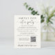 Elegante e orçamental elopeia de creme leve ou pequeno anúncio de casamento e convite de festas de recepção de casamento ou celebração. A frente apresenta "Felizmente, nunca depois da festa" em uma simples tipografia e um roteiro de na moda com pestanas. Personalize seu anúncio e convite com mais detalhes, crie um código QR vinculado ao seu site de casamento para que seus convidados pesquisem mais informações e RSVP on-line e adicione seus nomes em um script semelhante a assinatura. O verso mostra sua foto favorita do casamento, seus nomes e data do casamento.