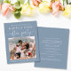 Azul empoeirado, economize o anúncio de data para uma recepção de casamento depois do seu apogeu ou do seu pequeno casamento privado. A frente apresenta sua foto do dia do casamento e "Salve a data para nossa festa feliz" em uma mistura de simples tipografia branca e um guião branco chico com balanços. Em sua foto, adicione seus primeiros nomes e data de recepção. No verso, personalize sua mensagem e adicione a parte ou a recepção salve os detalhes da data e seus nomes em um script semelhante a assinatura.