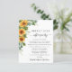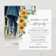 Eleição russa e econômica ou pequeno anúncio de casamento e uma recepção de casamento ou convite de festas de celebração. A frente apresenta um buquê de aquarela de girassóis e eucalipto verde e "Felizmente Nunca Depois da Festa" em uma mistura de simples tipografia e um roteiro de na moda com pântanos. Personalize o anúncio do casamento e o convite para recepção de casamento com mais detalhes e adicione seus nomes em um script semelhante a assinatura. O verso mostra sua foto favorita de casamento, seus primeiros nomes e datas de casamento e recepção.
