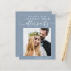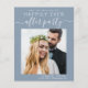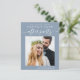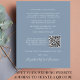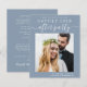 O moderno elopemento azul empoeirado e amigável / anúncio de casamento privado salvou a data que apresenta sua foto e "Salve a data para nossa festa feliz sempre depois" em uma mistura de uma simples tipografia branca e um roteiro branco chic com balanços. Sob sua foto, adicione seus nomes, data de recepção e local; no verso, personalize seu anúncio de casamento, insira seu endereço de site de casamento para criar um código QR para seus convidados pesquisar mais informações e adicionar seus nomes em um script semelhante a assinatura.
