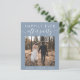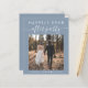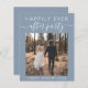 Elegância azul empoeirada, anúncio de casamento privado e convite de festas de recepção ou celebração. A frente apresenta "Felizmente, Sempre Depois da Festa" em uma tipografia branca moderna e um roteiro branco na moda com pestanas, sua foto, nomes e data de casamento. No verso, personalize seu anúncio de casamento e seu convite de recepção, crie facilmente um código QR vinculado ao seu site de casamento para que os convidados vejam suas fotos de casamento, todos os detalhes e para RSVP on-line, e adicione seus nomes em um roteiro semelhante a assinatura.