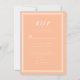 Simples e elegante, esta placa de gabinete RSVP de casamento moderna apresenta um design minimalista com uma borda dupla de quadros em branco nítido em um fundo de pêssego contemporâneo. Personalize com a data do seu casamento e os itens de menu selecionados. Espaços fornecidos para seu convidado adicionar seus nomes e respostas para uma resposta de retorno. As letras e os scripts estão em branco nítido. A parte traseira da placa corresponde a pêssego sólido.