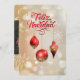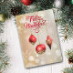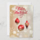 Aqui está um elegante cartão de Natal plano moderno com roteiro na moda vermelho que diz "Feliz Navidad" na frente. Três lâmpadas vermelhas brilhantes de Natal penduradas no texto. A imagem e o texto vermelho são colocados sobre um fundo bonito de floco de neve branco-boque. A parte traseira do cartão tem sua própria fotografia enquadrada com o mesmo fundo do boque e vários campos de texto para você personalizar.