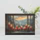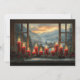 Christmas Day, Beautiful snowy mountain winter home, with view of sunset out a bay window with brightly lit red Christmas Candles, Pine Cones and Red Berries on the window sill.