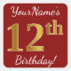 Este simples design de aniversário apresenta uma mensagem como "O 12 de Aniversário do VossoNome!", com o "12" a ter uma aparência falsa/imitada de cor inspirada em ouro, num fundo de cor vermelha. O nome pode ser personalizado. Os adesivos como estes poderiam talvez ser um presente para alguém que comemora o seu décimo segundo aniversário, ou talvez pudessem ser usados como decorações numa festa de aniversário. [~Z0000245]