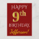 Este simples e personalizado design de cartão de aniversário mostra a mensagem "FELIZ 9º ANIVERSÁRIO", com o "9º" a ter uma aparência falsa de ouro. A frente também apresenta um nome personalizado e um fundo vermelho. A parte de trás apresenta uma mensagem de saudação de aniversário personalizada, juntamente com o endereço personalizável do destinatário do cartão postal de aniversário. Pode ser enviado a alguém que comemora seu nono aniversário. [~Z0000071]