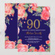 Convite de Aniversário para 90 Vermelho para Mulheres. Flor Botânica De Aquarela Dourada Glitter. Fundo Azul marinho. Flores Florais De Pêonias Rosa. Aniversário Adulto. Para mais personalização, clique no botão "Personalizar" e use nossa ferramenta de design para modificar este modelo.